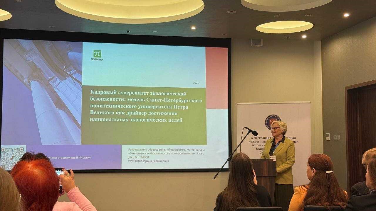Ирина Русскова выступила с докладом на тему «Кадровый суверенитет экологической безопасности: модель Санкт-Петербургского политехнического университета Петра Великого как драйвер достижения национальных экологических целей». В своем выступлении Ирина Русскова представила основные научные направления исследований, проводимые Инженерно-строительным институтом в рамках Программы Приоритет 2030, условия приема на магистерскую программу «Экологическая безопасность в промышленности», а также рассказала об организации подготовки школьников в экологическом классе Росприроднадзора, созданного при участии ведущих преподавателей Инженерно-строительного института. В конце доклада Ирина Русскова продемонстрировала видеоролик, посвященный деятельности ИСИ в сфере экологии.