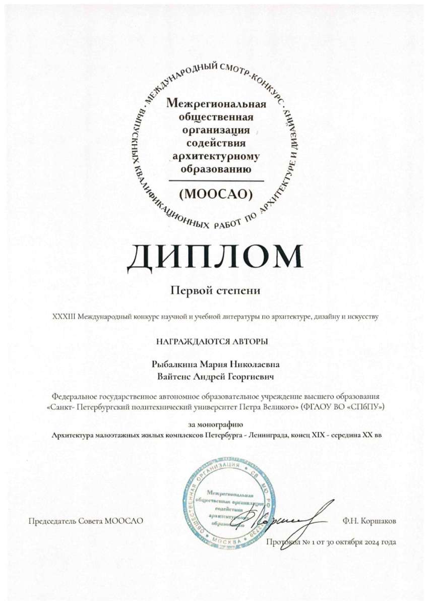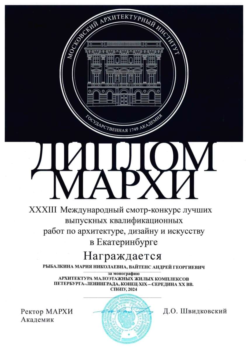 - Монография "Архитектура малоэтажных жилых комплексов Санкт-Петербурга- Ленинграда, конец XIX - начала XX века" авторов Андрея Вайтенса и Марии Рыбалкиной получила диплом 1 степени и диплом МАРХИ.