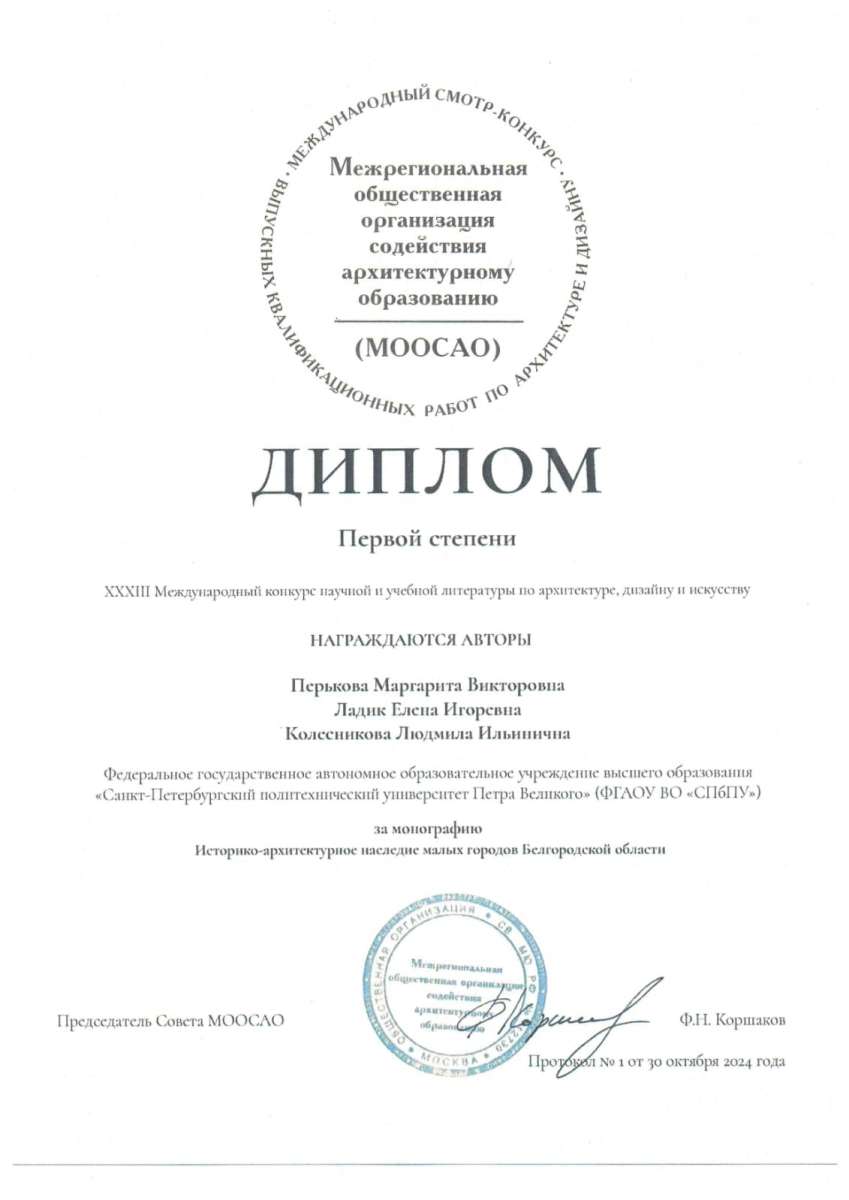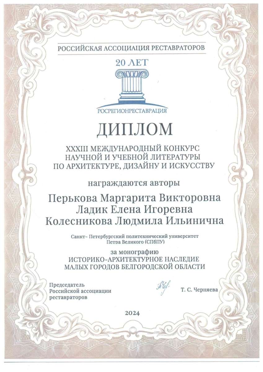 - В номинации монографии книга "Историко-архитектурное наследие малых городов Белгородской области" авторов Маргариты Перьковой, Елены Ладик и Людмилы Колесниковой получила диплом 1 степени и диплом Российской Ассоциации Реставраторов.