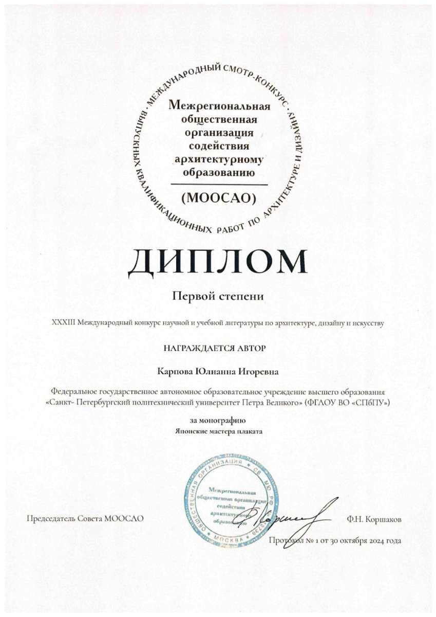 - Монография "Японские мастера плаката" Юлианы Карповой получила диплом 1 степени.