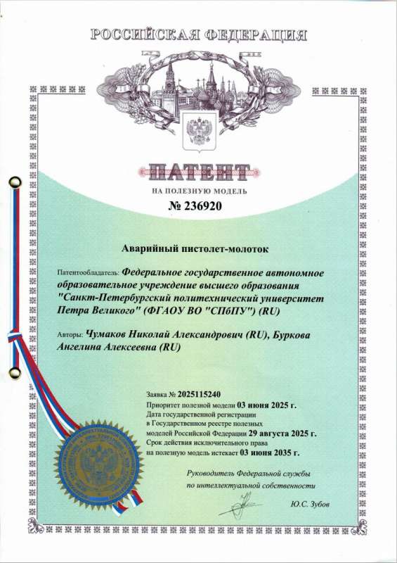 В Инженерно-строительном институте разработано инновационное устройство для обеспечения безопасности пассажиров общественного транспорта — аварийный пистолет-молоток. Авторами изобретения выступили доцент и магистрант Высшей школы техносферной безопасности Николай Чумаков и Ангелина Буркова. Разработка направлена на повышение доступности и надёжности экстренной эвакуации при чрезвычайных ситуациях и уже получила патент на полезную модель в Федеральной службе по интеллектуальной собственности.