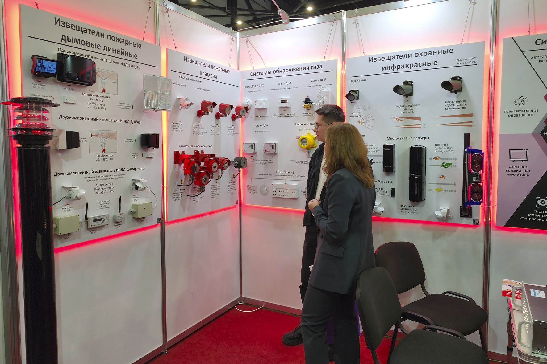 На экспозиции были представлены образцы средств пожарной автоматики, пожаротушения, оповещения при пожаре, средства огнезащиты и инновационные огнетушащие вещества.
