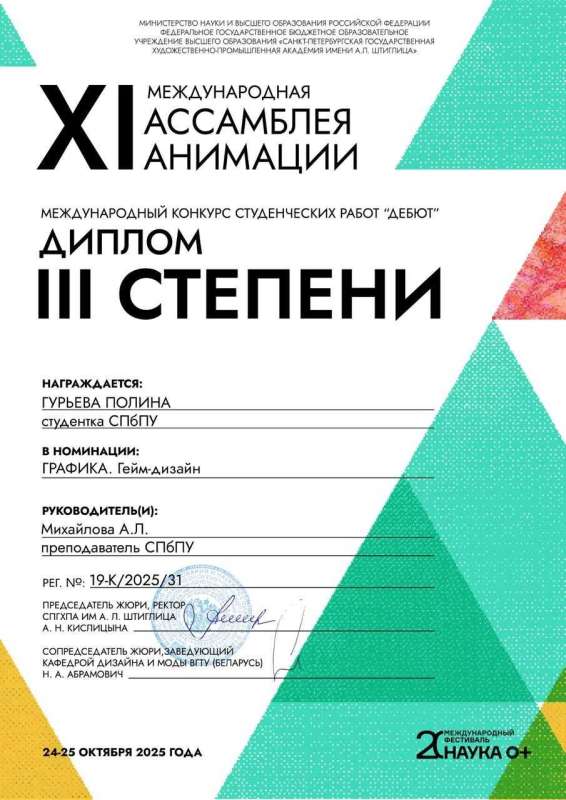 - Полина Гурьева — III место в номинации «Графика. Гейм-дизайн»