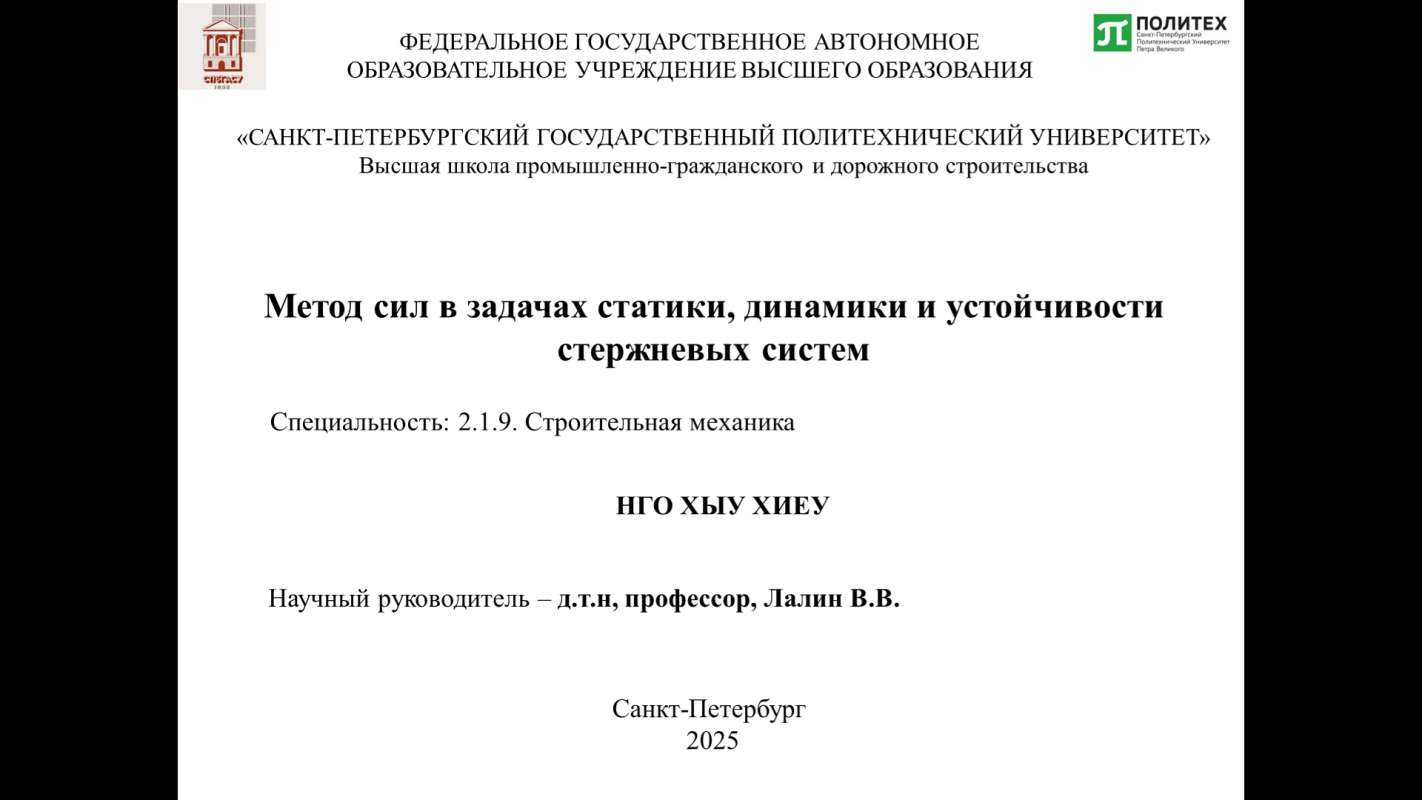 Диссертационное исследование на тему «Метод сил в задачах статики, динамики и устойчивости стержневых систем» выполнено по научной специальности 2.1.9 — «Строительная механика» под научным руководством доктора технических наук, профессора Высшей школы промышленно-гражданского и дорожного строительства Владимира Лалина.